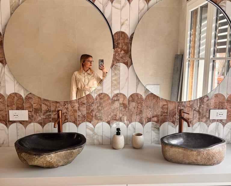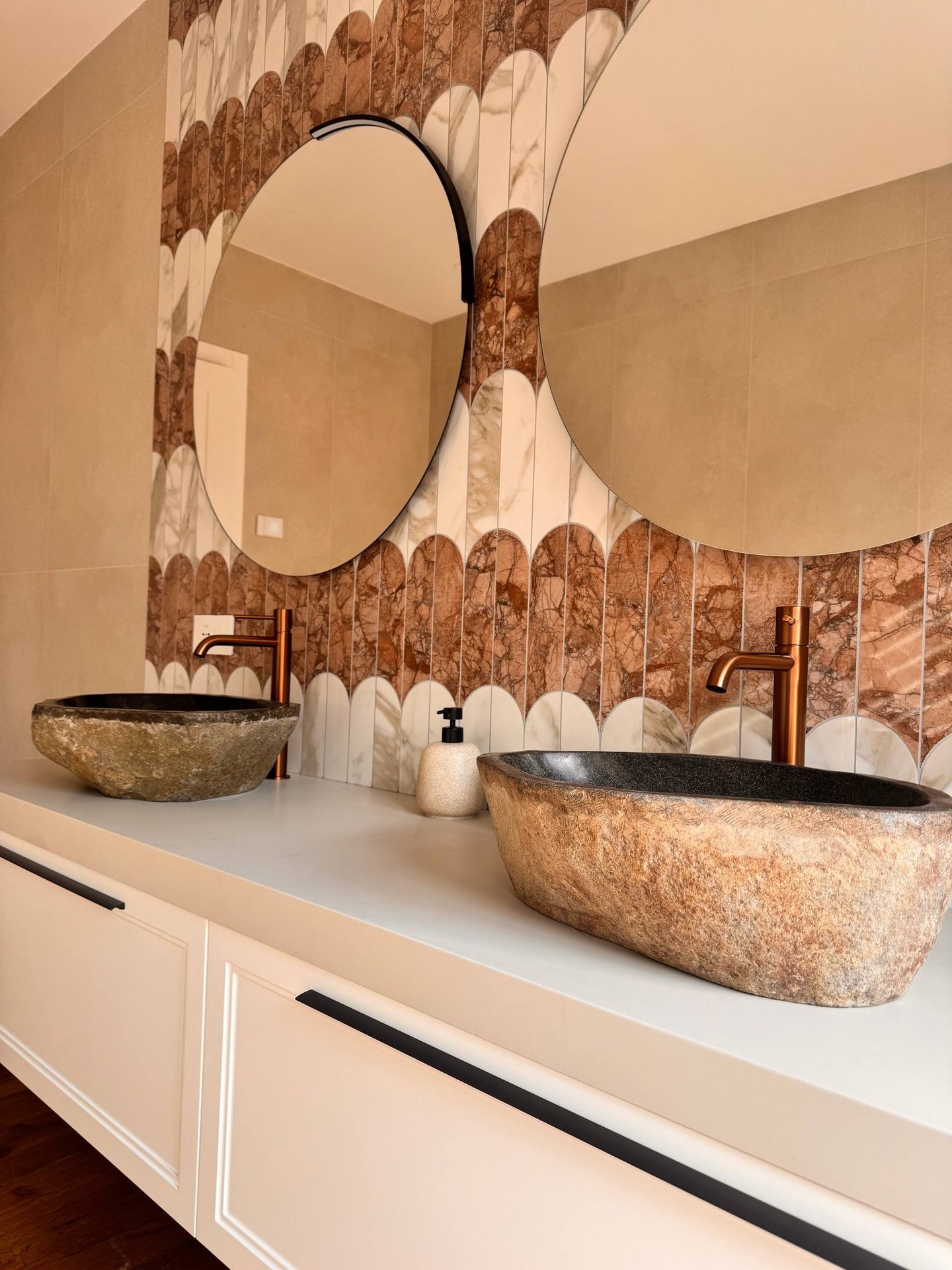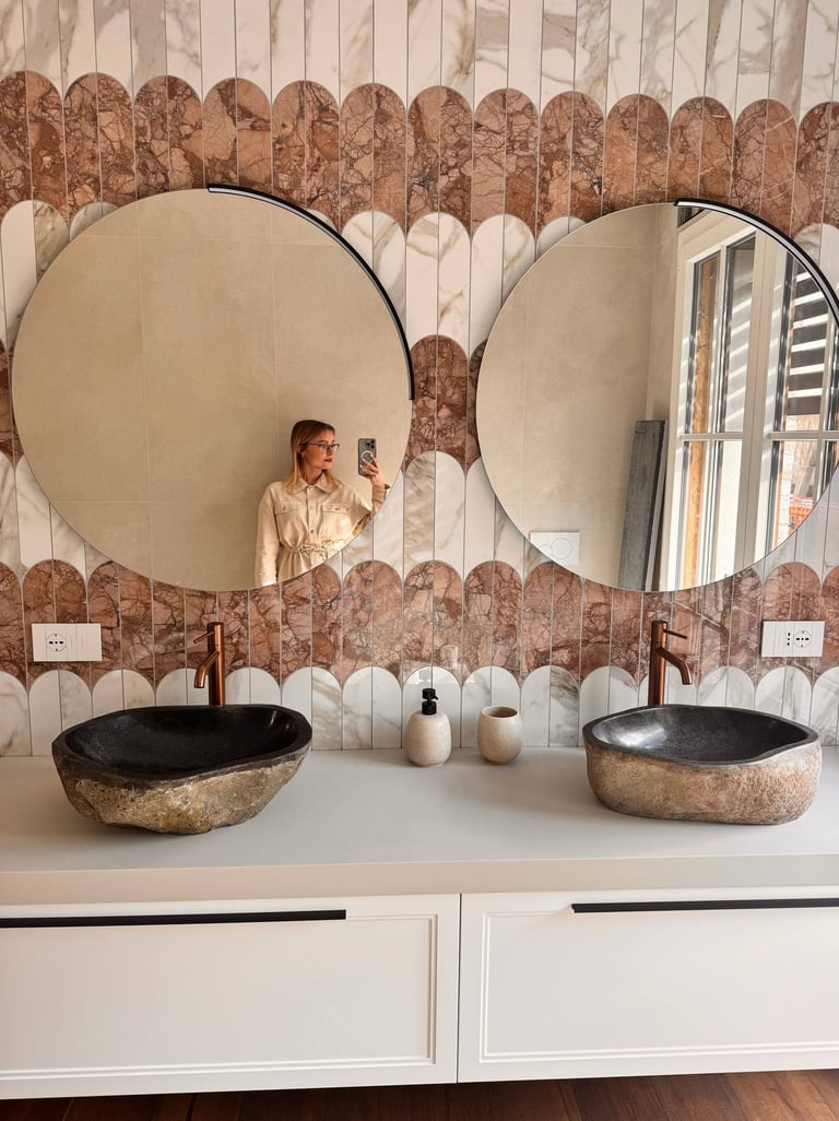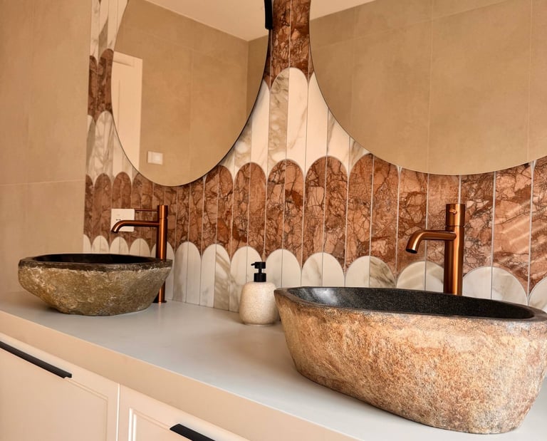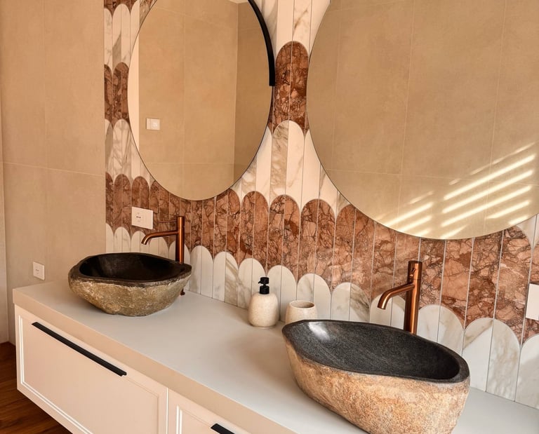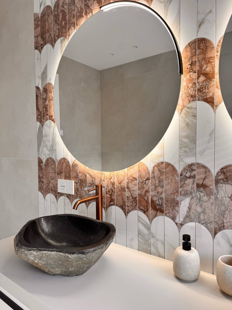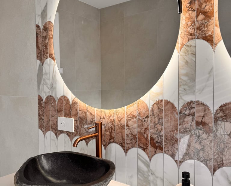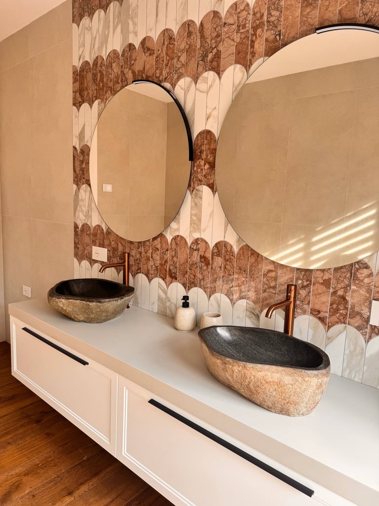 Un ambiente pensato per unire materia e carattere, dove rivestimenti scenografici e dettagli caldi creano un equilibrio elegante e accogliente.