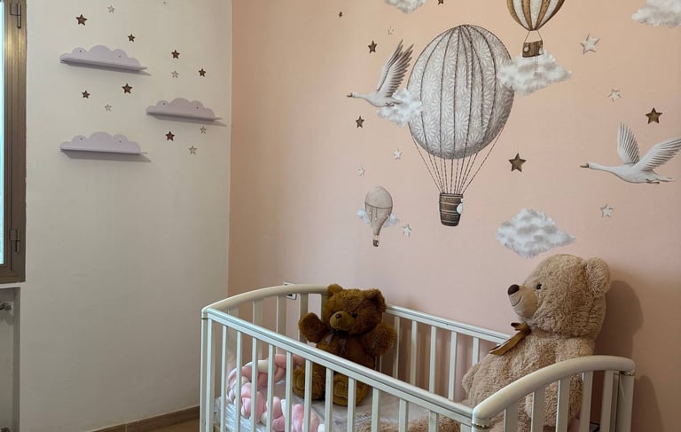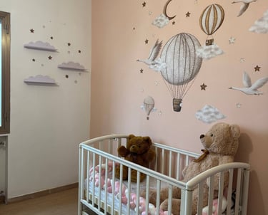 Uno spazio delicato e accogliente, progettato per accompagnare i primi momenti con dolcezza, tra tonalità morbide e dettagli sognanti.